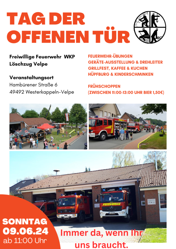 Der Löschzug der Freiwilligen Feuerwehr Westerkappeln-Velpe öffnet die Hallentore und lädt alle Interessierten zu einem spannenden und informativen Tag der offenen Tür ein. Die Veranstaltung findet am Sonntag, dem 09. Juni 2024 im Feuerwehrgerätehaus an der Hambürener Straße 6, 49492 Westerkappeln statt und beginnt um 11:00 Uhr.