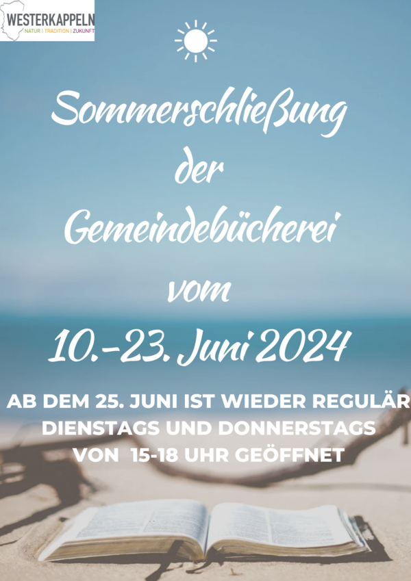 Die Gemeindeverwaltung teilt mit, dass die Gemeindebücherei Westerkappeln in der Zeit vom 10. Juni bis 21. Juni 2024 geschlossen bleibt. Ab Dienstag, dem 25. Juni 2024 ist die Gemeindebücherei wieder regulär jeweils dienstags und donnerstags von 15:00 Uhr bis 18:00 Uhr für Sie geöffnet. Wir freuen uns auf Ihren Besuch.