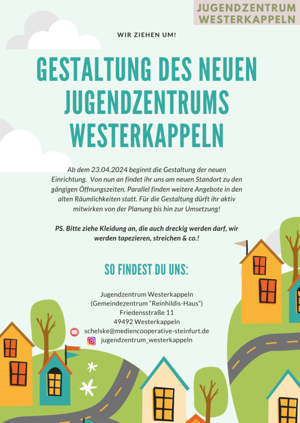 Das Jugendzentrum Westerkappeln, in Trägerschaft der Mediencooperative Steinfurt e.V. zieht um. Ab dem 1. Mai 2024 werden die Türen des Jugendzentrums im Reinhildis Haus im katholischen Pfarrheim in der Friedensstraße 11, 49492 Westerkappeln, geöffnet sein.